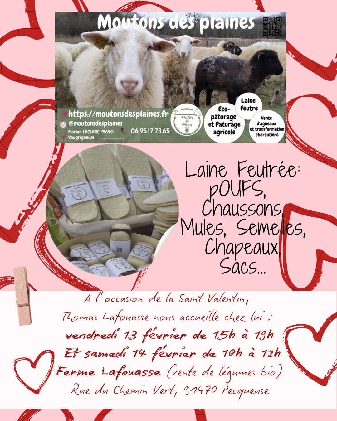 Pour célébrer la Saint-Valentin, Moutons des Plaines sera exceptionnellement accueilli chez Thomas, à la ferme LAFOUASSE rue du chemin vert, 91470 Pecqueuse, pour un rendez-vous chaleureux et authentique :